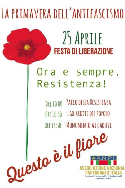 “Il 25 aprile sia una grandissima festa unitaria a sostegno della democrazia e della Costituzione” Lo afferma l’ANpi Civitavecchia che per la giornata ha organizzato due iniziative: la deposizioe di una rosa sotto la targa che ricorda la partigiana Irma Bandiera e un altro momento al Parco della resistenza.