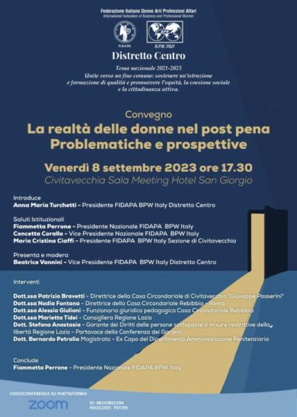 La Sezione FIDAPA BPW Italy di Civitavecchia ospiterà venerdì 8 settembre un importante convegno del Distretto Centro dal titolo “La realtà delle Donne nel post pena: Problematiche e prospettive”.