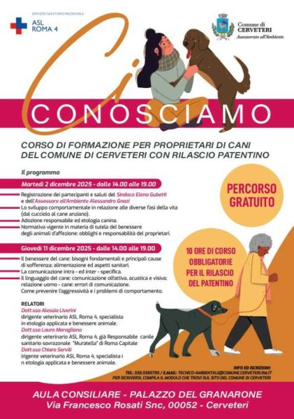 “Ad oggi la normativa nazionale consente a tutti di poter detenere un animale, anche senza alcuna formazione o preparazione – ha dichiarato l’Assessore all’Ambiente del Comune di Cerveteri Alessandro Gnazi – le cronache nazionali, purtroppo di cronaca nera, ci hanno però dimostrato che il non avere esperienza, ha portato ad aggressioni, che in alcuni casi si sono rivelate essere anche mortali. Anche per questo motivo, abbiamo fortemente voluto come Amministrazione comunale organizzare e proporre, a titolo completamente gratuito, questo corso valido per il rilascio di un patentino per il possesso dei cani”.
