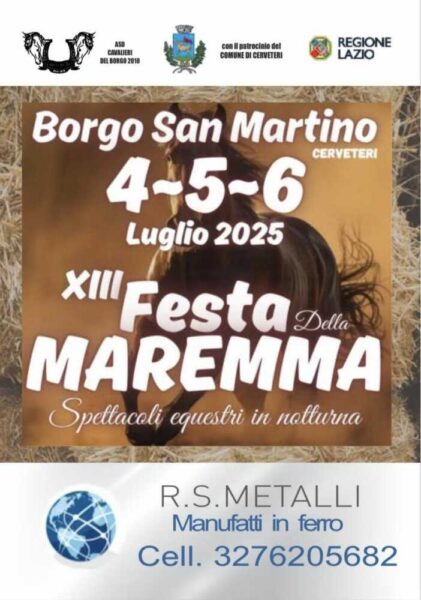 Da tredici anni è uno degli appuntamenti più attesi del mese di luglio: nella Frazione di Borgo San Martino a Cerveteri, nelle giornate di venerdì 4, sabato 5 e domenica 6 luglio torna la Festa della Maremma, manifestazione storica e celebre per i meravigliosi spettacoli equestri in notturna, oltre ai numerosi momenti di intrattenimento, stand di artigianato e di enogastronomia locale. Ad organizzarla, come di consueto, l’Asd Cavalieri del Borgo con il Patrocinio dell’Assessorato alla Cultura del Comune di Cerveteri e della Regione Lazio.