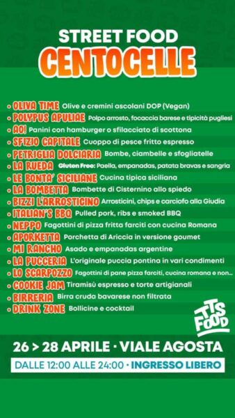 Un appuntamento “on the road” da non perdere che vedrà la presenza in Viale Agosta di 20 selezionatissimi maestri dello street food che trasformeranno davanti ai vostri occhi materie prime di assoluta e certificata qualità in veri e propri piatti gourmet. Sarà l’occasione per degustare ghiottonerie che riempiranno un menù da far girare la testa. Delizie dolci e salate per tutti i gusti. Antipasti sfiziosi e fritti di ogni genere. Primi piatti romani, carni, pesce ed incredibili novità dall’estero.