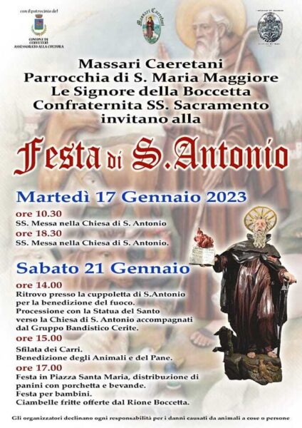 A Cerveteri torna uno degli appuntamenti più attesi dalla cittadinanza e tipici della tradizione etrusca, la Festa di Sant’Antonio Abate. Ad organizzarlo, i Massari Ceretani, la Parrocchia di Santa Maria Maggiore, le Signore della Boccetta e la Confraternita SS. Sacramento.