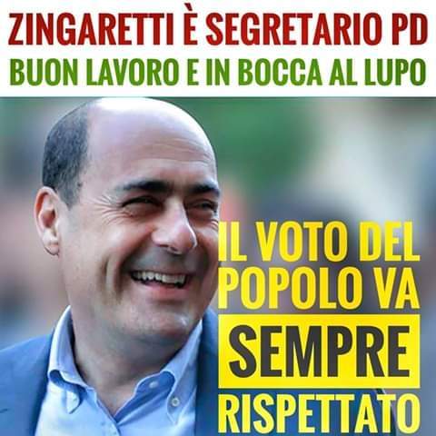 Al nuovo Segretario Nazionale del mio Partito, Nicola Zingaretti, faccio i più sinceri auguri di buon lavoro.