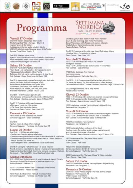 Durante la Settimana si alterneranno nelle varie location mostre fotografiche, proiezioni di film nordici, mostre, workshop di ceramica, conferenze sull’ utilizzo di materiali artistici sostenibili, installazioni, presentazioni di libri di cucina tipica norvegese e di esperienze italo-norvegesi, proiezioni di film nordici, mostre fotografiche, concerti di musica nordica.