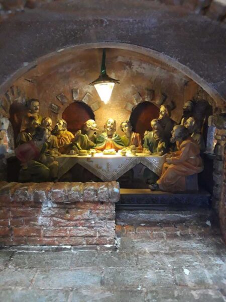 Ecco quindi che si vede Gesù a dorso di un asinello che entra a Gerusalemme, tra gli Osanna dei fedeli fino all’ultima Cena con gli Apostoli, poi la preghiera nell’Orto degli Ulivi, la cattura e il processo di Pilato. Non mancano la flagellazione e la crocifissione. C’è anche il momento in cui, salendo verso il Calvario, Gesù trova la Vergine Maria e la Veronica che gli asciuga il viso. Dopo c’è la deposizione dalla croce e la sepoltura nel sepolcro, chiude il Presepe la sua Resurrezione.