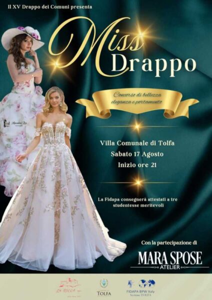 Il prossimo appuntamento per il Drappo sarà sabato sera al giardino l’elezione di Miss Drappo 2024, evento a cura della Fidapa Tolfa. La reginetta scelta dalla giuria la domenica pomeriggio sfilerà insieme ai sindaci prima della corsa che si potrà anche seguire dal maxischermo allestito in piazza.