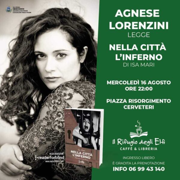 Mercoledì 16 Agosto alle ore 22:00 ci sarà come ospite l’attrice Agnese Lorenzini che leggerà e interpreterà dei brani tratti dal libro “Nella città l’inferno” di Isa Mari, Readerforblind Editore. Adattamento testo e regia di Valerio Valentini.
