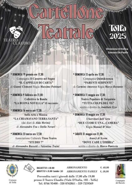 Al Claudio di Tolfa, dopo il cinema è arrivato il momento del teatro. Domenica infatti si inaugura il cartellone della stagione propsta dal Comune per il 2025, curato come sempre dalla direttrice artistica Simona De Paolis.