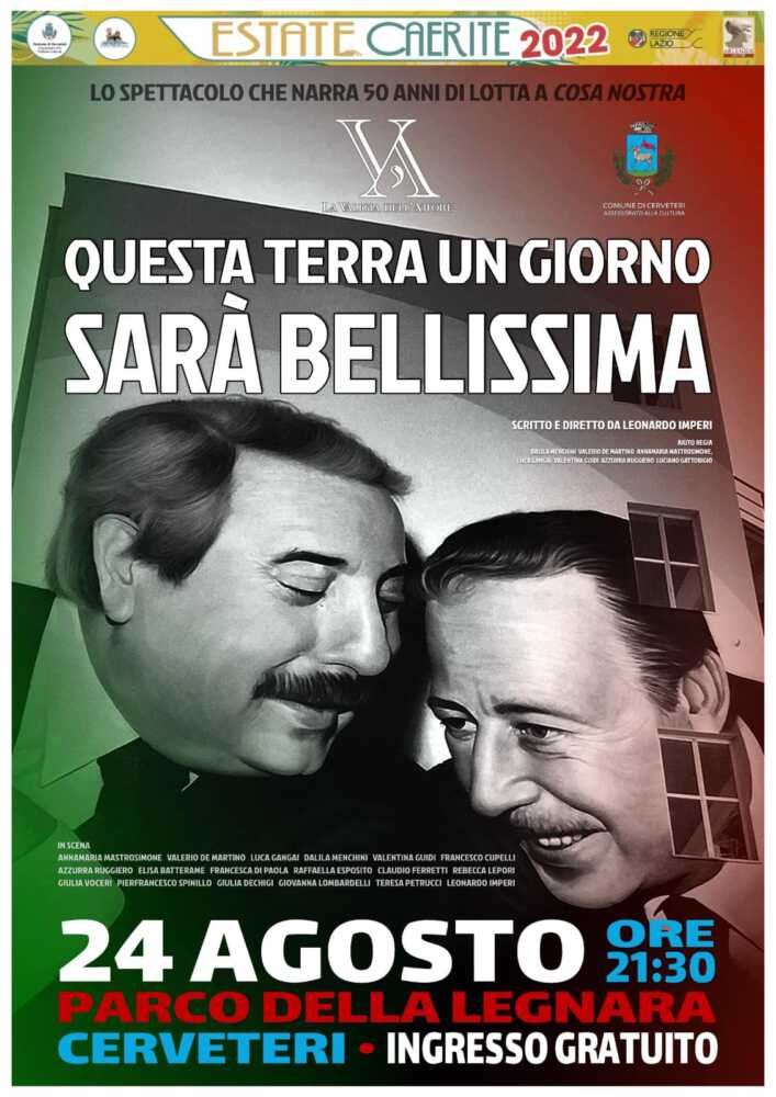In occasione del trentennale dal barbaro attentato di stampo mafioso nei confronti dei Giovanni Falcone e Paolo Borsellino, all’interno del programma dell’Estate Caerite 2022 il Comune di Cerveteri insieme alla compagnia “La Valigia dell’Attore”, propone lo spettacolo teatrale “Questa terra un giorno sarà bellissima”, una pièce che ripercorre mezzo secolo di lotta alla mafia, a Cosa Nostra, a partire dal 1971 fino ad oggi.
