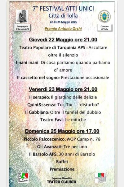 Il teatro Claudio di Tolfa si prepara ad ospitare la settima edizione del “Festival degli Atti unici”, un concorso che ha il patrocinio del Comune del paese collinare ed è organizzato dalla compagnia stabile locale “Il Barsolo”.