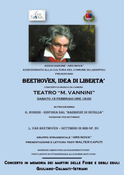 Grande appuntamento sabato 19 febbraio alle ore 18.00 presso il Teatro Marco Vannini con il concerto della Ars Nova “Beethoven, Idea di Libertà” a cura del Maestro Sergio Cozzi, con il Patrocinio dell’Assessorato alla Cultura, Turismo e Sport del Comune di Ladispoli. Musiche di Rossini (Sinfonia dal Barbiere di Siviglia) e Beethoven (Settimino in Mib. Op. 20).