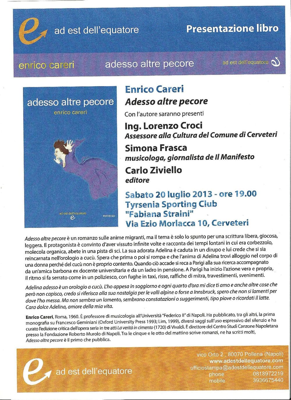Si terrà sabato 20 luglio alle ore 19.00 presso il Centro Sportivo Tyrsenia Sporting Club ‘Fabiana Straini’ di Via Ezio Morlacca, n.10 la presentazione del libro di Enrico Careri ‘Adesso altre pecore’. All’evento, prenderanno parte anche Simona Frasca, Musicologa e giornalista de ‘Il Manifesto’, e Carlo Zivello, editore del libro.