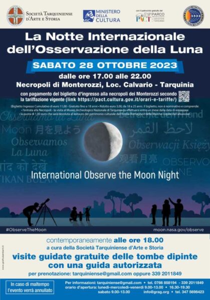 Tarquinia (VT), 27 ottobre 2023 – Rinviata per il maltempo la scorsa settimana, viene riproposta a Tarquinia, alla necropoli dei Monterozzi, sabato 28 ottobre, dalle 17 alle 22, la “Notte Internazionale dell’Osservazione della Luna”, iniziativa nata nel 2010 da un’idea degli scienziati delle missioni NASA Lunar Reconnaissance Orbiter, Lunar Crater Observation e Sensing Satellite.
