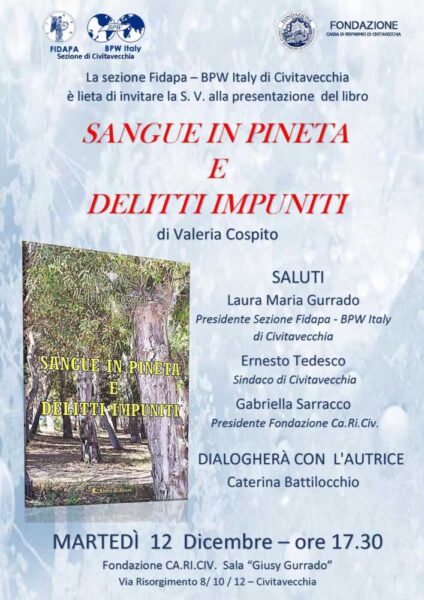 Martedì 12 dicembre alle ore 17.30, presso la Sala Giusy Gurrado della Fondazione CaRiCiv. di Via Risorgimento, la sezione di Civitavecchia della Fidapa BPW Italy, presieduta da Laura Maria Gurrado, presenterà il romanzo SANGUE IN PINETA E DELITTI IMPUNITI, Aletti editore, della scrittrice Valeria Cospito. Sarà presente l’autrice con la quale dialogherà Caterina Battilocchio.