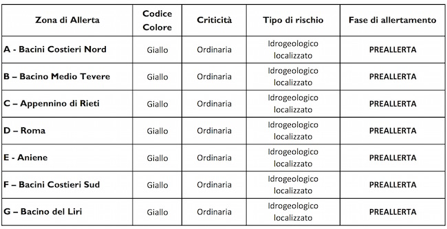 L’allerta è di codice giallo su tutto il territorio della Regione Lazio.
