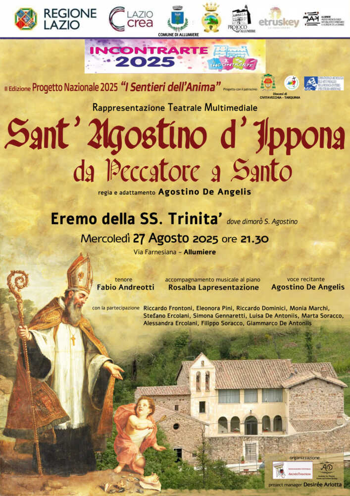 Si è svolto ieri sera, presso l’Eremo della Santissima Trinità, l’atteso spettacolo multimediale “Sant’Agostino d’Ippona: da peccatore a Santo”, diretto e adattato dal regista Agostino De Angelis. L’evento, promosso dal Comune di Allumiere nell’ambito del cartellone “IncontrArte 2025” e organizzato dall’Associazione Culturale “ArchéoTheatron”, ha richiamato un discreto pubblico di fedeli e curiosi, attratti anche dal fascino del luogo.