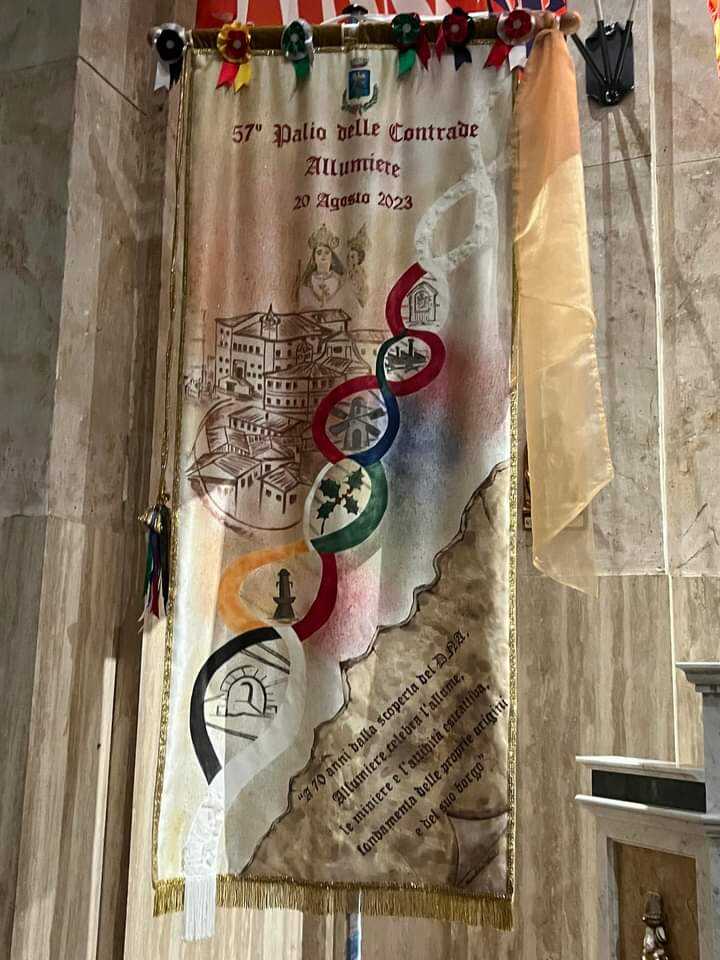 È un omaggio all’allume, un minerale a cui Allumiere deve le proprie origini, la propria storia e cultura. Il minerale insito nel codice genetico, nelle radici di questo paese, come rappresentato magistralmente dall’artista Maria Luisa Taranta in questo meraviglioso cencio, accolto dalla caleidoscopica folla di contradaioli che lo hanno portato nella Chiesa dell’Assunta, dove resterà esposto fino a domenica”.