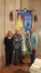 Dopo il Cencio ha percorso i pochi metri che separano il palazzo comunale dal sagrato della chiesa, dove si è tenuta la seconda parte della manifestazione, con le sei dame che hanno attaccato al Cencio le coccarde coi colori delle contrade. Poi è seguito il Rito della sabbia, pensato da Eureka per simboleggiare lo scorrere del tempo, ovvero la sfida che si rinnova anno dopo anno. Un’ampolla clessidra (offerta dal Caffè Centrale di Giammaria Brunori) ha accolto i colori delle sei contrade, così da creare una stratificazione unica di diverse tinte, come a dire: sei contrade differenti e “avversarie” ma unite dall’amore per il Palio. La sabbia, hanno spiegato da Eureka, è stata scelta perché se un granello è impalpabile e volatile, milioni di granelli sono dune robuste, come le sei contrade.