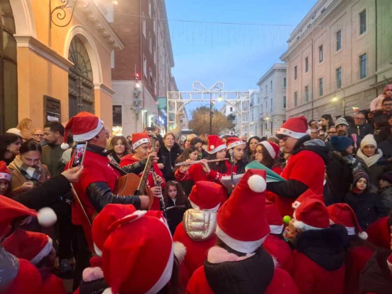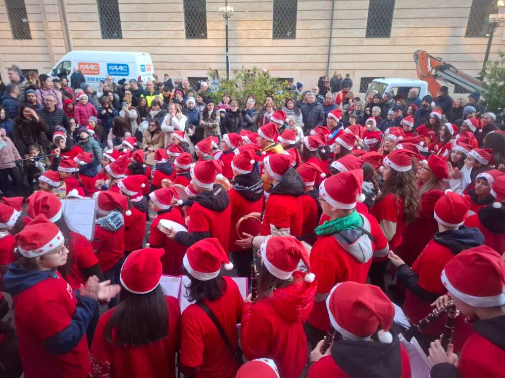 Su invito dell’Amministrazione Comunale, il gruppo di circa un centinaio di piccoli musicisti, ha suonato e cantato i brani della tradizione, in attesa dell’accensione delle luminarie e dell’albero natalizio davanti al Teatro Traiano.