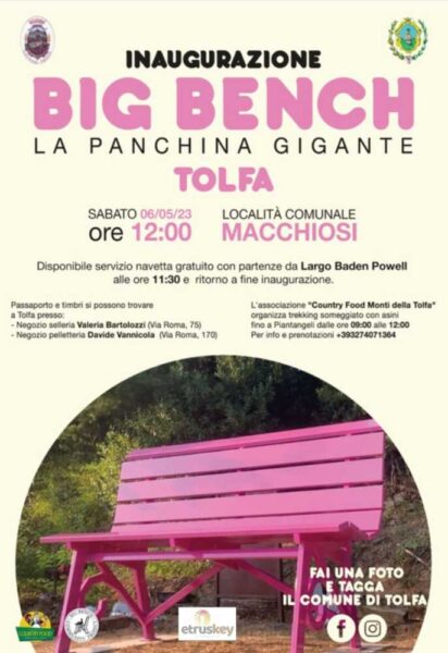 La Fondazione BBCP Big Bench Community Project è un’iniziativa no profit promossa dal designer americano Chris Bangle insieme alla moglie Catherine, nata molto tempo fa nelle Langhe. Ma la rete delle Big Bench è ormai internazionale, ed esiste un vero e proprio “passaporto” su cui far apporre i timbri di tutte le mega panchine che si sono visitate. A Tolfa, libretti e timbri si trovano lungo via Roma nella selleria di Valeria Bartolozzi e nella pelletteria di Davide Vannicola.