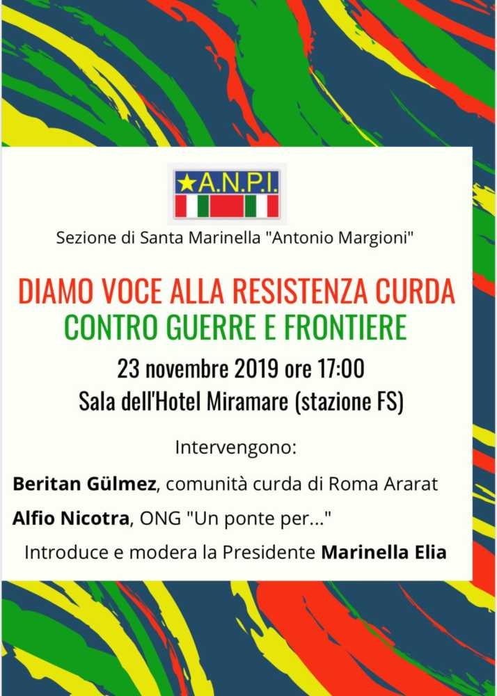 ”La sezione ANPI di Santa Marinella “Antonio Margioni” ha organizzato per sabato 23 novembre 2019 alle ore 17.00 presso la sala dell’Hotel Miramare, (stazione ferroviaria di S. Marinella), un incontro pubblico dal titolo: “Diamo voce alla resistenza curda.