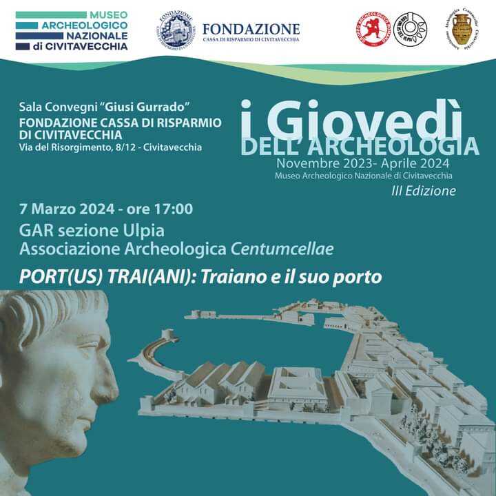 La terza edizione del ciclo di incontri culturali “I giovedì dell’archeologia”è organizzata dal Museo Archeologico Nazionale di Civitavecchia con il sostegno della Fondazione Cassa di Risparmio di Civitavecchia e la collaborazione del Gruppo Archeologico Romano – Sezione “Ulpia” di Civitavecchia e dell’Associazione Archeologica Centumcellae di Civitavecchia