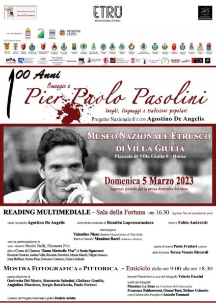Il 5 marzo il Museo sarà aperto gratuitamente, il pubblico potrà visitarlo e inoltre poter assistere all’evento che si terrà come reading multimediale alle ore 16.30 nella Sala della Fortuna fino ad esaurimento posti. Al reading nel quale interverrà il Direttore, l’attore regista Agostino De Angelis con un percorso multi artistico tra parola, musica, canto e video proiezioni ci condurrà nel mondo di uno dei personaggi che maggiormente hanno caratterizzato la cinematografia e la cultura italiana nel secolo scorso. Un viaggio tra storia, politica, letteratura, religione, il cambiamento della società, l’inquinamento e la differenza tra sviluppo e progresso. Affiancheranno il regista De Angelis, il tenore Fabio Andreotti con il commento musicale di Rosalba Lapresentazione, il M° Massimo Bacci violinista e direttore d’orchestra con un intervento su Bach e Pasolini, la partecipazione diNicole Belli, Eleonora Pinie gli allievi del Corso di Cinema dell’Associazione Santa Marinella Viva di Sonia Signoracci, Andrea Vella, Riccardo Dominici, Riccardo Frontoni, Monia Marchi, Filippo Soracco, Josar Baffioni, Nerina Piras, Giacomo Costanzo, Nadia Cardinali, in scena gli abiti di Teresa Venuto Riccardi e le sculture di Paolo Frattari.