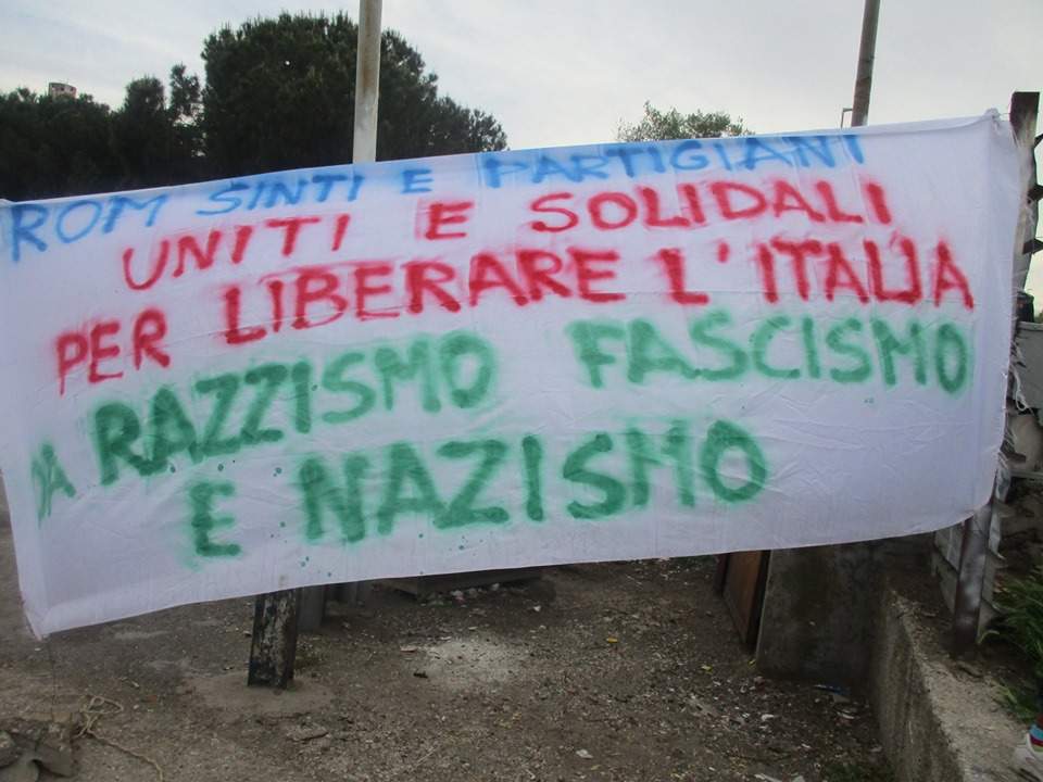 “L’assemblea svoltasi davanti allo striscione esposto dal Consiglio Nazionale Rom Sinti Caminanti di Salviati sul quale era scritto “Rom Sinti e Partigiani, Uniti e Solidali per Liberare l’Italia da Razzismo, Fascismo e Nazismo” si è conclusa con un liberatorio ballo collettivo dedicato alle donne Rom ingiustamente rinchiuse nel Cie di Ponte Galeria, tra cui Gordana Sulejmanovic attivista del Camping River e degli #indivisibili, madri di famiglia dello stesso campo di Via Salviati, donne nate in Italia, a cui è negata sia la cittadinanza italiana che il permesso di soggiorno umanitario”.