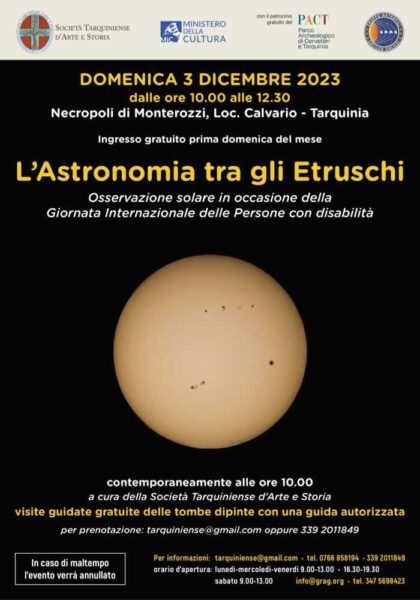 Il 3 dicembre, con il patrocinio del Parco archeologico di Cerveteri e Tarquinia (PACT) e in concomitanza con la “Giornata Internazionale delle persone con disabilità”, nella suggestiva cornice della necropoli dei Monterozzi, custode delle tombe dipinte etrusche dichiarate patrimonio mondiale dell’umanità dall’Unesco, si terrà, dalle 10,30 alle 12, l’osservazione del sole con i telescopi messi a disposizione dal CrAG, per ammirarne macchie e protuberanze.