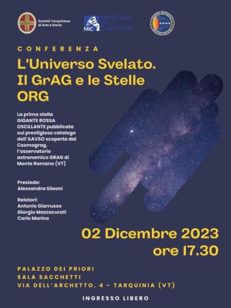 Si parte il 2 dicembre alle 17,30, alla sala Sacchetti, al civico 4 di via dell’Archetto, con la conferenza dal titolo “L’universo svelato: il GrAG e le stelle ORG”, incentrata sulla prima stella gigante rossa scoperta al Cosmograg, l’osservatorio astronomico del GrAG a Monte Romano, e pubblicata sul prestigioso catalogo AAVSO. A parlarne gli esperti Antonio Giarrusso, Giorgio Mazzacurati e Carlo Marino. L’incontro è patrocinato dal Ministero della Cultura (MiC).