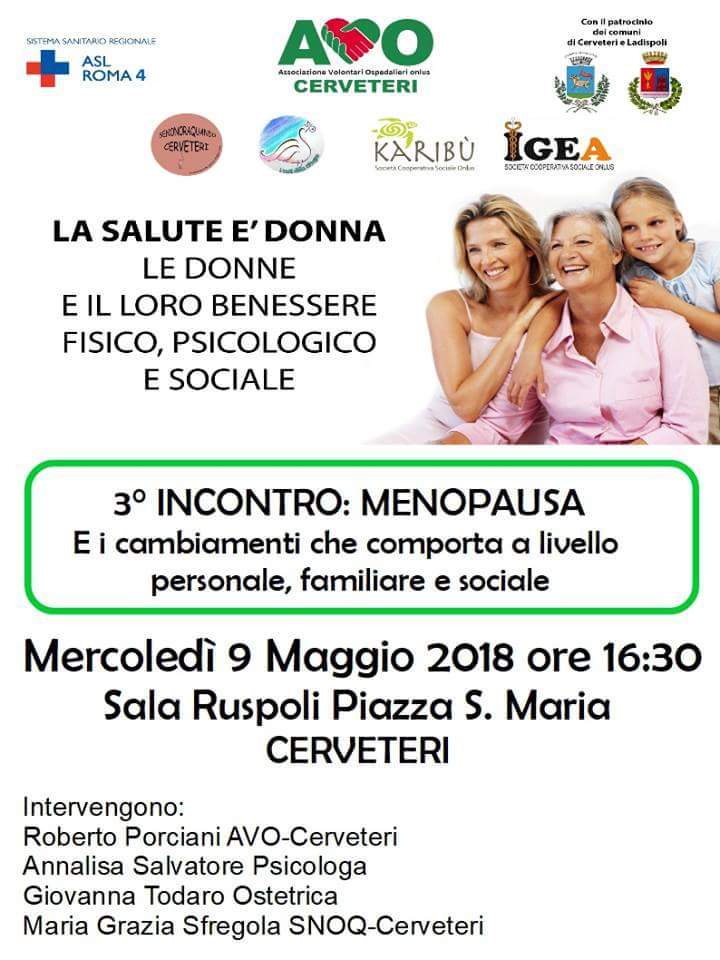 AVO-Cerveteri, con il Patrocinio dei Comuni di Cerveteri e Ladispoli e della ASL RM4 ed in collaborazione con SENONORAQUANDO-Cerveteri, l’OASI DELLA CICOGNA e le Cooperative Sociali IGEA e KARIBU’, presenta il terzo ed ultimo incontro del ciclo di conferenze dal titolo “LA SALUTE E’ DONNA” ed invita alla più ampia partecipazione, in particolare le donne del territorio di Cerveteri e Ladispoli.