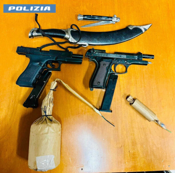 Oltre agli ordigni sono stati anche rinvenute due pistole replica modello “Glock”, una modello “Beretta”, priva di tappo rosso, con munizionamento a salve ed un coltello tipo scimitarra della lunghezza di circa 40 centimetri. L’uomo è stato quindi arrestato, perché gravemente indiziato del reato di detenzione di armi, munizionamento e congegni esplosivi.