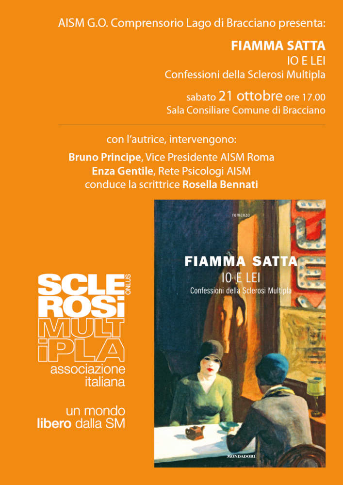 “Io e lei. Confessioni della sclerosi multipla” è un romanzo che narra quella che, secondo l’autrice, è “paradossalmente una storia d’amore”.  Fiamma Satta sceglie un punto di vista spiazzante e anticonformista che le consente di raccontare vicende emotive autobiografiche con autenticità ed energia rare.Sabato 21 ottobre, alle ore 17, nella Sala Consiliare del Comune di Bracciano, il Gruppo Operativo Comprensorio Lago di Bracciano AISM presenta “Io e Lei. Confessioni della sclerosi multipla”.Con l’autrice intervengono Bruno Principe, Vice Presidente della Sezione AISM di Roma, Enza Gentile, Rete Psicologi AISM. Moderatrice dell’incontro è la scrittrice Rosella Bennati.