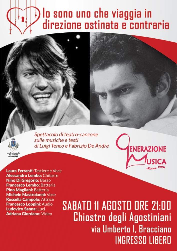 Sabato 11 agosto alle ore 21.00, al Chiostro degli Agostiniani a Bracciano, Generazione Musica e Military Blues Band presentano: “Io sono uno che viaggia in direzione ostinata e contraria”, spettacolo di teatro-canzone su Luigi Tenco e Fabrizio De Andrè. A questo evento teniamo molto per la grande statura dei due personaggi, veri giganti della musica italiana, per la capacità di rendere fruibili a tutti, attraverso l’espressione musicale, le loro idee innovative e trasversali.