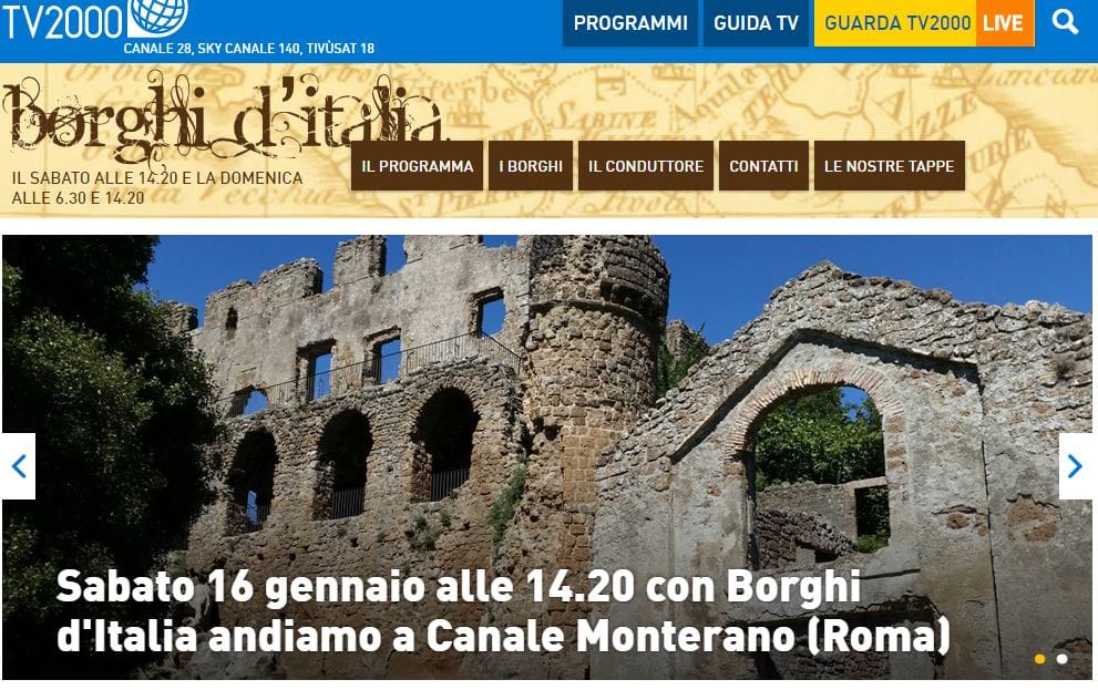 Così il sindaco di Canale Monterano Angelo Stefani commenta il servizio andato in onda questo pomeriggio nell’ambito del programma Borghi D’Italia di TV 2000 e che verrà replicato domani 17 gennaio alle ore 6.20 e domenica 23 gennaio alle 14.20. Trenta minuti durante le quali il conduttore Marco Placidini visita luoghi e presenta molti personaggi del borgo. Il video viene trasmesso su Digitale Terrestre Canale 28, Sky Canale 140 ed è reperibile sui siti www.tv2000.it e www.tv2000.it/borghiditalia.
