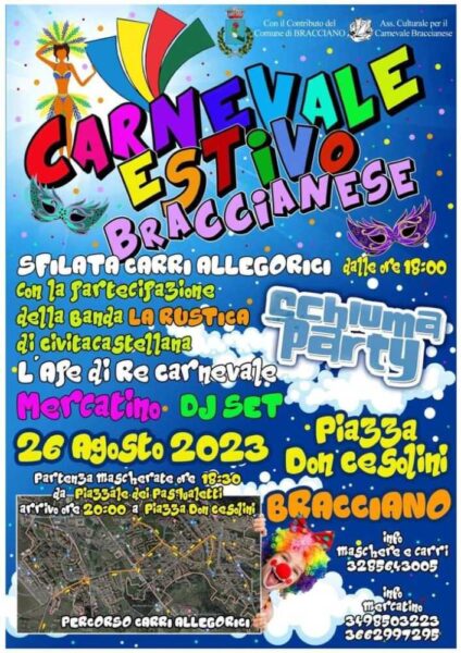 A Bracciano in piazza Don Cesolini musica e spettacoli a ritmo di carnevale. Come è successo per febbraio, sabato vi sarà il Carnevale estivo di Bracciano , evento che è organizzato dall’associazione culturale per il carnevale Braccianese, con il patrocinio del comune di Bracciano e la partecipazione dell’associazione commercianti. Dal pomeriggio a notte fonda vi saranno una serie di iniziative coinvolgenti e simpatiche, a partire dalla sfilata dei carri accompagnati dalla banda La Rustica di Civita Castellana. Molte le novità , dalla musica dance in piazza Don Cesolini alla schiuma party dedicato a bambini e ragazzi. E inoltre mercatini e stand gastronomici per rendere ancora più piacevole il carnevale.