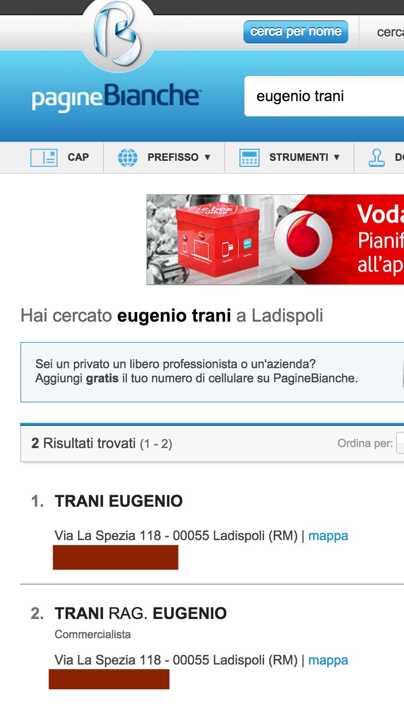 Per completezza va inoltre detto che nell’elenco della Pagine Bianche al civico 118 di via la spezia Ladispoli risulta sia la persona Trani Eugenio che Trani, Rag. Eugenio con due numeri telefonici differenti.