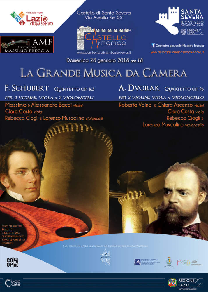 Dopo il grande successo dell’ultimo concerto “Vivaldiana” con il tutto esaurito nella Sala del Nostromo domenica 28 gennaio alle ore 18.00, i solisti dell’Associazione Massimo Freccia, diretti da Massimo Bacci, saranno i protagonisti del concerto dedicato alla “ Grande musica da camera”. Ultima esecuzione del ciclo invernale della Stagione concertistica “Castello Armonico” realizzata dalla Regione Lazio in collaborazione con Lazio Crea, Mibact, Comune di Santa Marinella e CoopCulture.