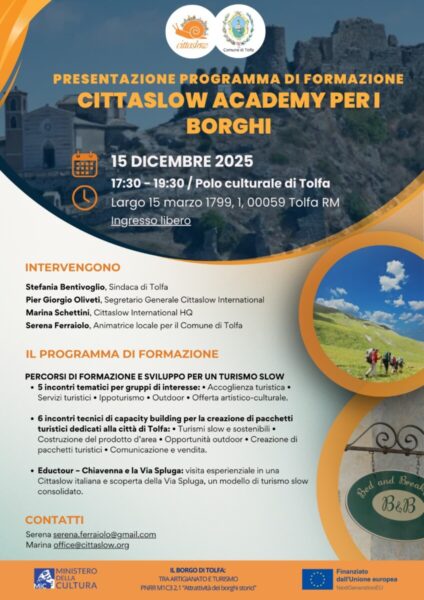 Lunedì 15 dicembre, ore 17.30 presso il Polo Culturale di Tolfa (Largo 15 marzo 1799, n. 1, si terrà il primo appuntamento di presentazione del Corso di professionalizzazione turistica offerto da Cittaslow Academy insieme al Comune di Tolfa.