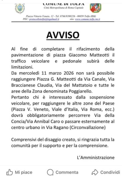 Peccato che i cittadini di Tolfa e soprattutto i commercianti di Piazza Vecchia questi disagi li stiano vivendo da mesi, con accessi chiusi, lavori interminabili e attività penalizzate ogni giorno.