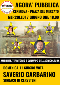 Il candidato sindaco del Movimento 5 Stelle di Cerveteri, Saverio Garbarino incontra i cittadini di Cerenova. L’appuntamento, al mercato di Cerenova, è per il 7 giugno alle 18 con un’Agorà in cui si parlerà di agricoltura, ambiente e territorio. Presenti all’appuntamento anche la portavoce 5 Stelle al Senato della Repubblica, Commissione permanente agricoltura e produzione agroalimentare Elena Fattori, la portavoce 5 Stelle alla Regione Lazio Silvana De Nicolò, il portavoce 5 Stelle alla Pisana Devid Porrello e il consigliere comunale pentastellato del comune di Bracciano Marco Tellaroli.
