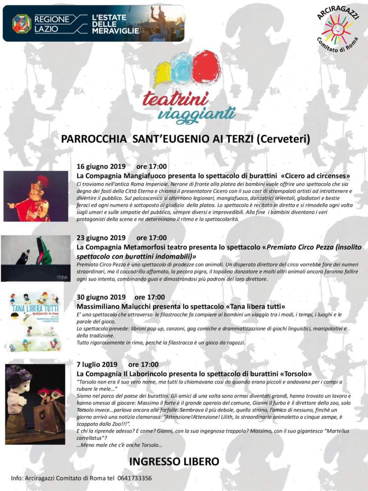 Un’originale iniziativa al Borgo de I Terzi, all’interno della Parrocchia Sant’Eugenio. Da Domenica 16 giugno, quattro appuntamenti ad ingresso gratuito tra teatro, spettacoli, racconti, burattini e filastrocche che faranno divertire, sognare e coinvolgeranno piccoli e grandi. “Teatrini Viaggianti” è il titolo della rassegna, organizzata da Arciragazzi – Comitato di Roma e sostenuta dalla Regione Lazio nell’ambito delle iniziative de ‘L’Estate delle Meraviglie’.