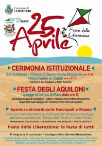 Riceviamo e pubblichiamo – “Come ogni 25 Aprile saremo in piazza per ricordare le donne e gli uomini, spesso giovanissimi, che hanno sacrificato le proprie vite per la nostra libertà. Sarà una festa per tutta la città, ed è per questo motivo che insieme alla doverosa cerimonia istituzionale proponiamo tante iniziative dedicate alle famiglie”. Il Sindaco di Cerveteri Alessio Pascucci annuncia così il programma organizzato dall’Amministrazione comunale in collaborazione con le realtà del territorio per la Festa della Liberazione.