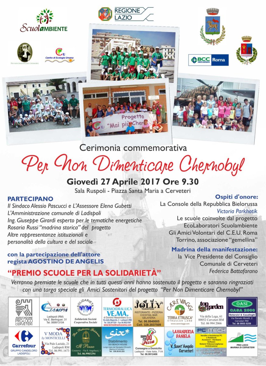 Riceviamo e pubblichiamo – “Sono trascorsi 31 anni da quello che viene ricordato come il più grande disastro nucleare della storia, ma ancora oggi in tante zone d’Europa se ne sentono le conseguenze. Giovedì 27 aprile ricorderemo quel momento drammatico, con immagini e testimonianze dei tanti volontari che in tutti questi anni si sono messi a disposizione per tanti progetti solidali, rivolti a tutti coloro, in particolar modo i bambini portano ancora sulla loro pelle i segni dell’incidente di Chernobyl”. Così il Sindaco di Cerveteri Alessio Pascucci presenta la Cerimonia Commemorativa ‘Per non Dimenticare Chernobyl’, organizzata come sempre dall’Associazione di Volontariato Scuolambiente per giovedì mattina alle ore 09.30 nei locali di Sala Ruspoli in Piazza Santa Maria.
