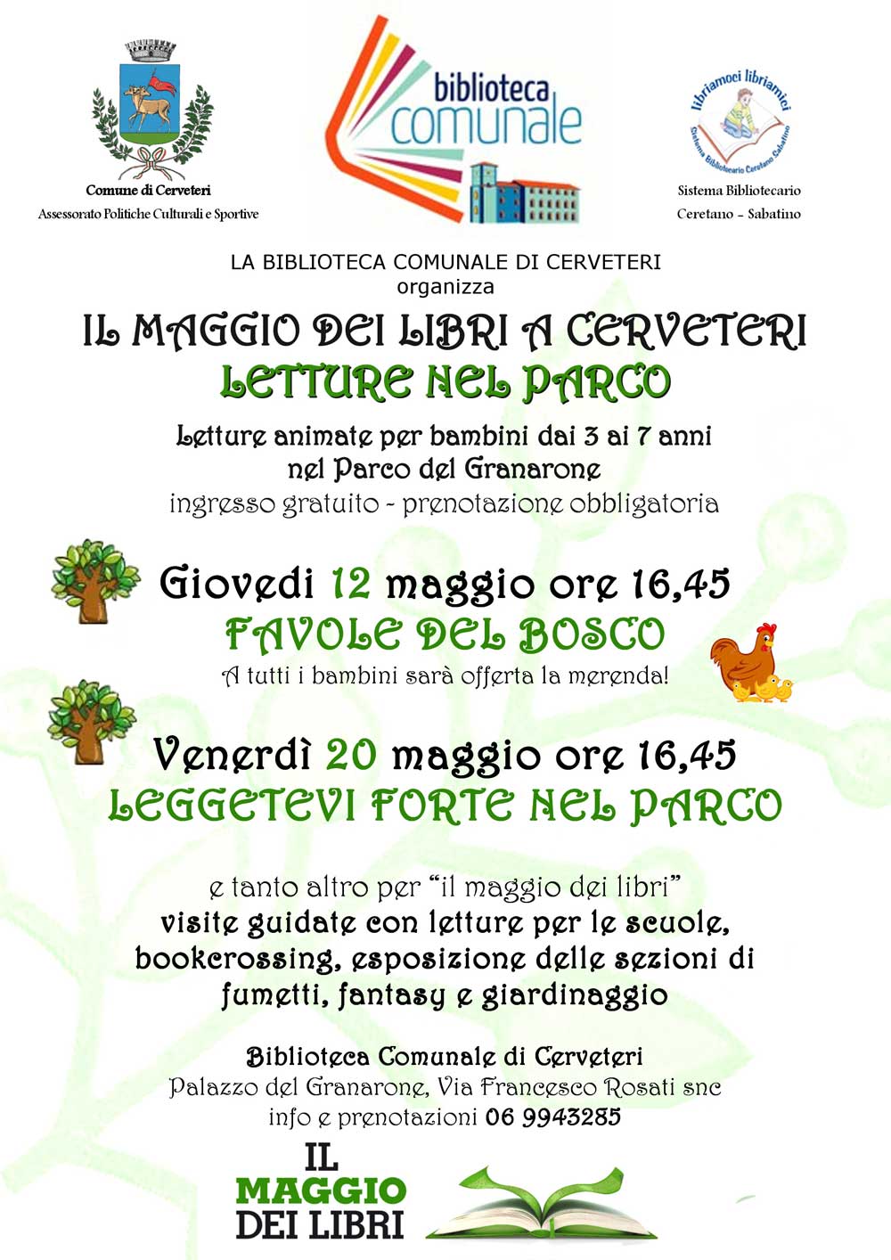 Maggio-Libri-2016-(1)Secondo appuntamento nella Biblioteca comunale di Cerveteri con il ‘Maggio dei Libri’. Venerdì 20 maggio, alle ore 16.45, l’Associazione Catapulta e l’Assessorato alle Politiche culturali del Comune di Cerveteri invitano le famiglie a ‘Leggetevi Forte nel Parco’, un divertente spettacolo di letture animate ad ingresso gratuito per tutti.