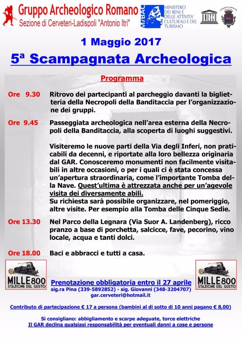 La mattinata del Gruppo Archeologico Romano prenderà il via alle ore 09.30, con il ritrovo dei partecipanti, fissato davanti la biglietteria della Necropoli della Banditaccia. Alle 09.45 prende il via la passeggiata archeologica nell’area esterna della Necropoli, con visita a Via degli Inferi, alla Tomba della Nave e alla Tomba delle Cinque Sedie. Per prenotazioni chiamare i numeri 3395892852 e 3483204707 oppure inviare una e-mail a gar.cerveteri@hotmail.it.