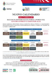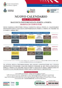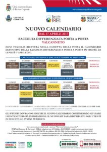Riceviamo e pubblichiamo – “Da lunedì 17 aprile 2017 nelle zone urbane di Cerveteri (Cerveteri alta, Marina di Cerveteri e Valcanneto) dove è già attivo il servizio di raccolta differenziata porta a porta, partirà il nuovo calendario.
