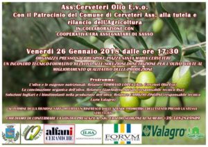 Un incontro tecnico-formativo relativo alle soluzioni di nutrizione per l’olivo, volte al miglioramento qualitativo delle produzioni. E’ quanto organizzato dall’Associazione Cerveteri Olio E.V.O., un’iniziativa patrocinata dall’Assessorato alla Tutela e Rilancio dell’Agricoltura del Comune di Cerveteri, con la collaborazione della Cooperativa Fra Assegnatari di Sasso, che si svolgerà presso i locali di Sala Ruspoli in Piazza Santa Maria venerdì 26 gennaio alle ore 17.30.