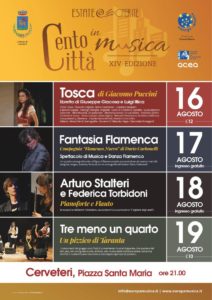 Da stasera, mercoledì 16 agosto, l’Assessorato alle Politiche Culturali del Comune di Cerveteri insieme ad Europa Musica propone la XIV edizione di Centocittà in Musica, quattro serate in cui nella cornice di Piazza Santa Maria si alterneranno opera lirica, flamenco, il ritmo della pizzica ed un’originalissima serata ispirata a Il Signore degli Anelli.
