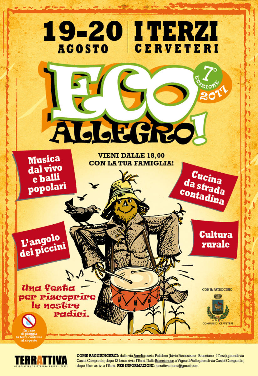 Sabato 19 e domenica 20 agosto nella Frazione de I Terzi di Cerveteri protagonista la festa EcoAllegro, una vera festa popolare pensata per divertirsi, mangiar bene e stare insieme come si faceva una volta. La rassegna, giunta alla sua settima edizione, è organizzata dal Comitato TerrAttiva e con il Patrocinio del Comune cerite.“Balli, giochi popolari, cucina tradizionale, i sapori della cucina di campagna e tanti prodotti rigorosamente a chilometri zero, come la pecora al callaro, i fritti di verdure, le polpette vegane e gli innovativi “Lamburger” e “Vegetalburger”, sono gli ingredienti principali di questa festa, diventata oramai una tradizione dell’Estate Caerite e che quest’anno festeggia la sua settima edizione – ha detto Federica Battafarano, Assessora alle Politiche Culturali del Comune di Cerveteri – spazio anche ai bambini, con un’ampia area a loro dedicata. Giochi e spettacoli circensi, danza sui trampoli e giocolerie realizzati in collaborazione con ‘il Teatro di Paglia’ e il ‘Teatro Circo Catapulta’. Nel corso della festa inoltre, sarà possibile visitare una bellissima mostra a tema all’interno delle Stanzette in Piazza Giovanni Falcone. Tanta musica in entrambe le serate: Sabato 19 agosto alle 21:30 si esibirà la compagnia musicale “Italia Migrante” con un repertorio live che abbraccia tutta la musica popolare italiana e delle sue regioni, mentre domenica 20 agosto dalle ore 20.00 tornano gli stornellatori “Giuliano e i pecorari laziali” con la musica popolare dialogata a suon di stornelli in rima improvvisati a ritmo di tamburelli. Saranno 2 spettacoli effervescenti e di un divertimento coinvolgente. Una serata per divertirsi con le note irresistibili di chitarre, fisarmoniche e tamburelli, per suonare e ballare il saltarello, la pizzica e la musica delle nostre radici”.